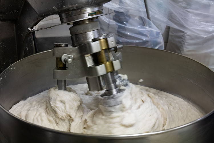 直ちに地魚の洗浄、採肉、晒し、絞り、ミンチ、塩ズリ等をへて臼で冷凍のすり身と混ぜ合わせ、水と添加物を加えて「すり身」に仕上げます。